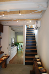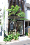 もともと長屋のあった、間口が2間弱、奥行きが6間弱の狭小敷地に建てた若手陶芸家のためのアトリエ+ギャラリー。灯油釜を3階に設置し、2階部分を陶芸教室もできるメインのアトリエに。1階の街路に面した部分は、作品を見せるギャラリー&ショップとなっています。南北に細長い敷地の制約から、建物の間口も一間半しかとれません。南と北はガラス面で抜けるようにして、西側の壁面は一面緑化。西の窓は緑のスクリーンを通してアトリエに光と風を取り込みます。鉄骨造ですが、多くの時間を過ごすアトリエの床は無垢の厚板です。ギャラリーは、ガラスビーズ洗い出しの床に、古材でつくったディスプレイ棚。やさしい陶器の風合いが引き立つ、ちょっと個性的なインテリア空間となりました。