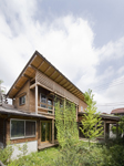 屋根は草屋根、エアコンなしで暮らしたい、外壁は板張りにしたい、という建て主さんの要望に対して土壁を提案。Studio PRANAで手がけた最初の本格的な小舞土壁の家です。土壁の防火性能によって、準防火地域でも外壁を板張りにする事ができるのです。充分な風通しを考え、北側の植栽や緑のカーテン等、植物の力をかりて、機械に頼らず心地よく夏を過ごすための工夫もしています。